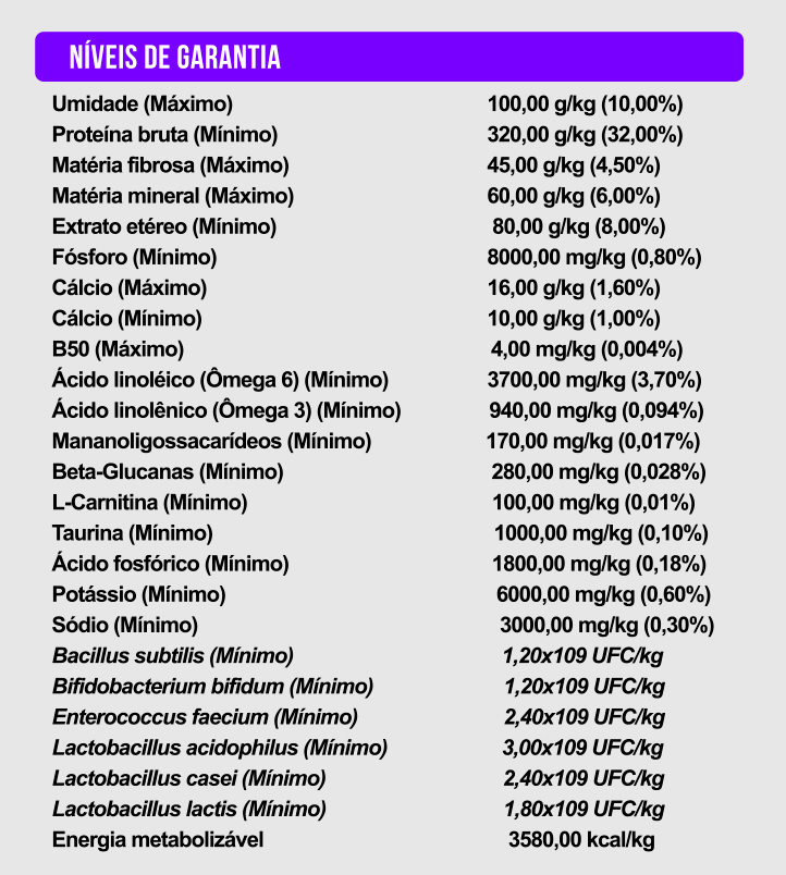 Farinha de vísceras de aves, Milho integral moído*, Farinha de carne e ossos, Quirera de arroz, Óleo de aves (3,00%), Polpa de beterraba, Farelo de glúten de milho 60*, Farelo de trigo, Premix vitamínico mineral (Cloreto de colina, Sulfato de zinco, Niacina, Pantotenato de cálcio, Vitamina B2, Vitamina B1, Selenito de sódio, Sulfato de ferro, Sulfato de cobre, Sulfato de manganês, Iodato de cálcio, Vitamina D3, Vitamina K3, Ácido fólico, Vitamina A, Vitamina B12, Biotina, Vitamina E e Vitamina B6), Óleo de linhaça (0,20%), Cloreto de sódio (sal comum), Cloreto de potássio, Taurina (0,10%), Extrato de yucca schidigera (0,03%), Farinha de pescado – salmão (1,00%), Aditivo prebiótico (0,10%), Aditivo probiótico (0,10%), L-Carnitina (0,01%), Aditivo regulador de acidez (Ácido fosfórico) (0,40%), Aditivo palatabilizante, Aditivo antifúngico fungistático (Ácido propiônico), Aditivo antioxidante (BHT e BHA).